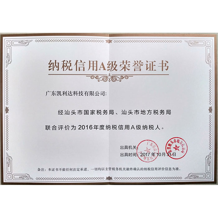 纳税信用A级荣誉证书--2016