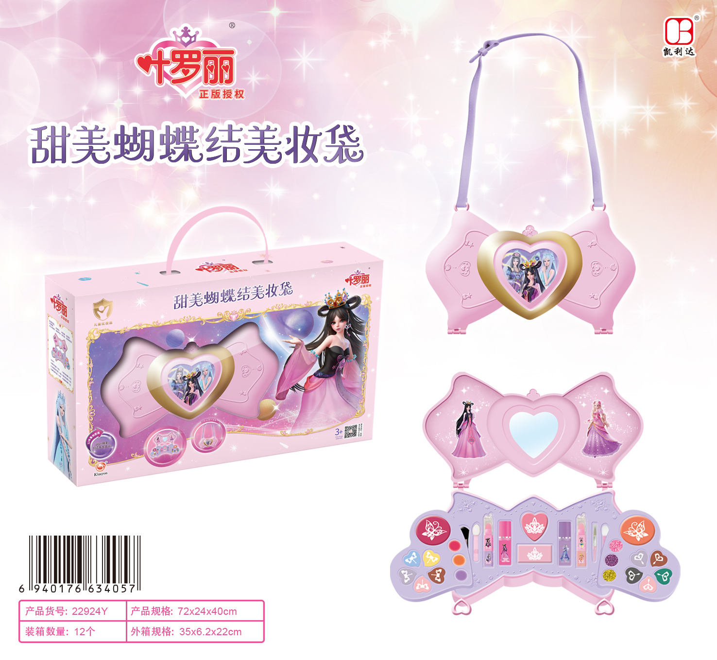 类产品: 10色哑光眼影膏,3色唇膏,3色闪粉唇彩,4色眼影膏,4条唇膏,2瓶趾甲油,4条化妆品刷,2张透明体标贴纸,1条背带