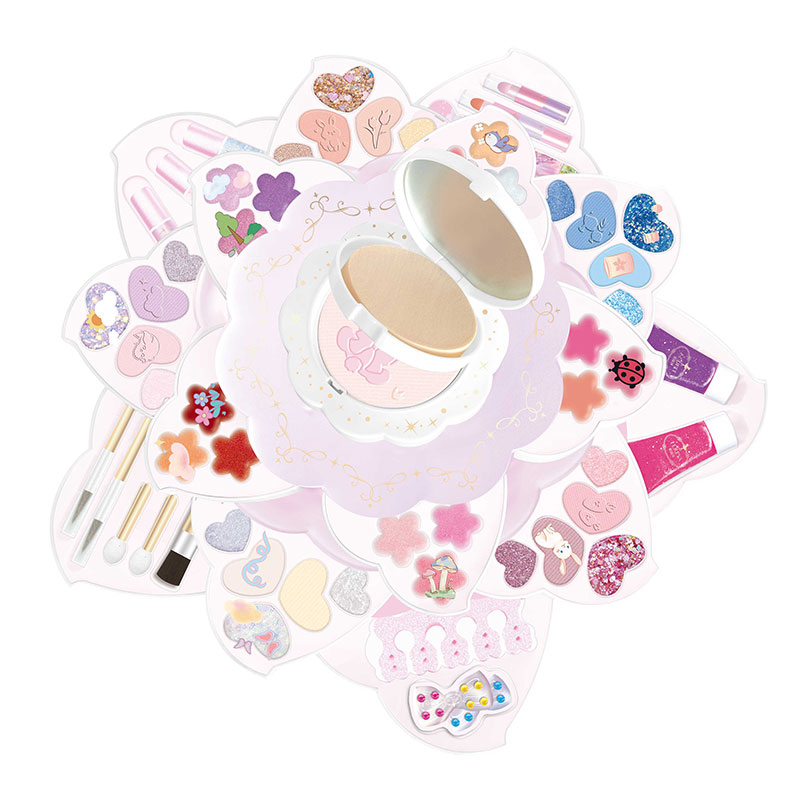 产品内容:1个双色粉饼,20个眼影,5个闪粉眼影,15个唇彩,2个啫喱,5支唇膏,3瓶水性指甲油, 1个分指器, 1条指甲锉,5支化妆刷,1个粉扑,1张宝石贴纸.